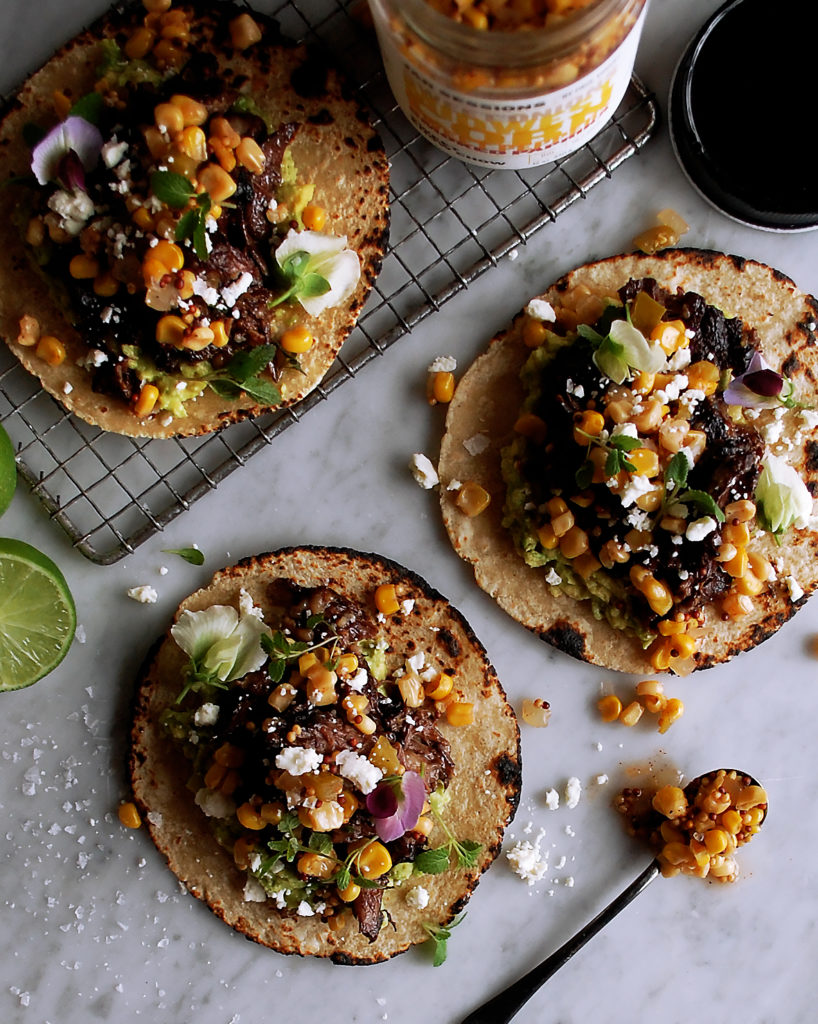This is one of my favorite jars out of the whole line. The chow chow is so versatile. It’s basically pickled Midwest corn flavored with sweet onions, peppers, mustard seeds, and smoked paprika. The second I tried it I immediately thought tacos!