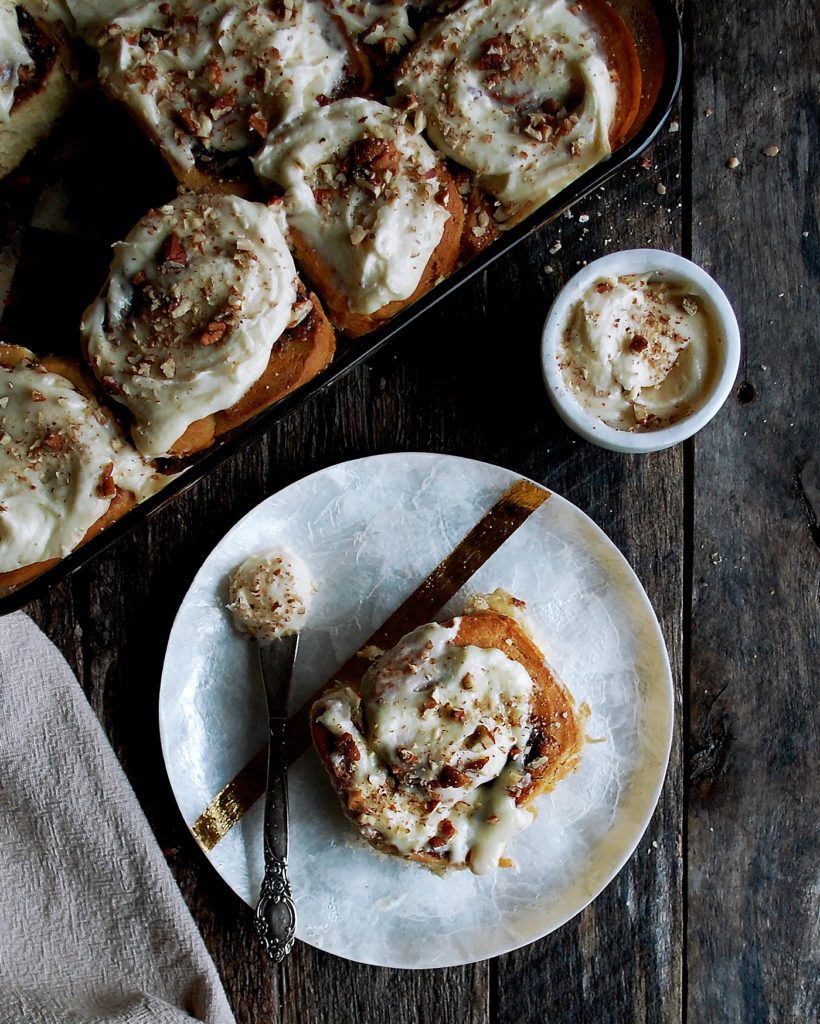Brown Butter Cinnamon Pecan Rolls with Cream Cheese Frosting