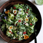 Assemble the salad by tearing the butter lettuce into slightly smaller pieces and tossing them into a large mixing bowl. Add the thinly sliced fennel, shaved asparagus, thinly sliced carrots, and snap peas. Drizzle in enough of the basil yogurt dressing to reach your desired consistency, tossing the salad as you go. Any leftover dressing can be stored in the refrigerator for another use. Serve the salad in a large bowl with the edible flowers as a garnish (if using).