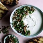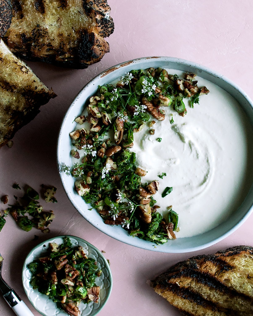 I truly LOVE this dip. Anything salty and creamy paired with charred bread is something that can easily become addicting. And then add a fresh toasted pecan dill gremolata on top? And you’ve got one really good dip.