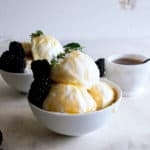 I like eating the frozen Greek yogurt right after it’s been churned for a soft-serve consistency. But you can also freeze it for a few hours and let it firm up.
