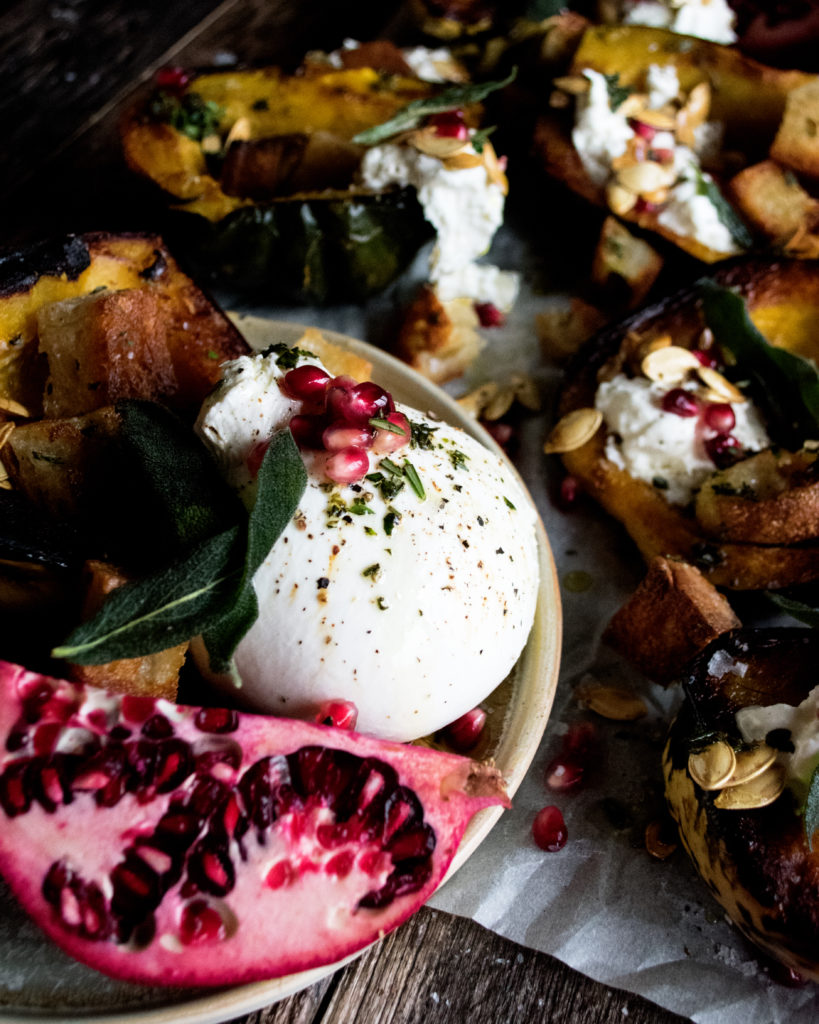 This festive starter is exactly what you need on your table right now. It’s roasted acorn squash with burrata & herbed ciabatta croutons…fun, messy, and delicious.