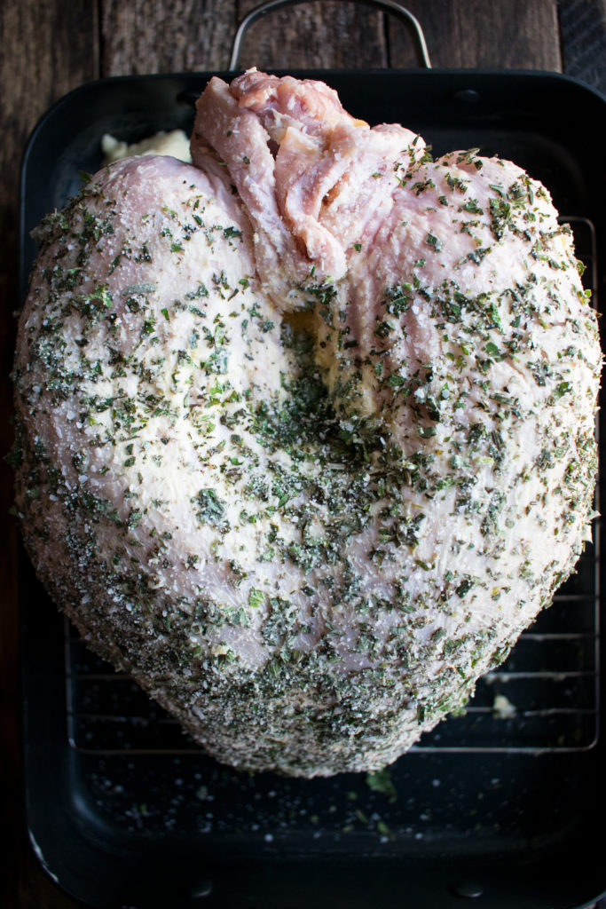 You’ll want to buy a bone-in turkey breast for this recipe. Roasting it with the bone in is the best way to get a juicy, tender finished product. You’ll smother the turkey in softened butter and top it with lots of salt and freshly chopped hearty herbs. The turkey will roast at a higher temperature to start in order to kickstart the browning process, then it’ll slowly roast at a lower temperature until done.