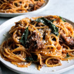 Technically speaking… you’ll sear the meat, transfer it to a plate, saute aromatics, add red wine + canned tomatoes + stock, add the meat back in, simmer for a few hours, remove and shred the meat, strain and reduce the sauce, add the meat back in, and then toss the whole thing with spaghetti. It takes a bit of time and love, but it’s a really simple process.