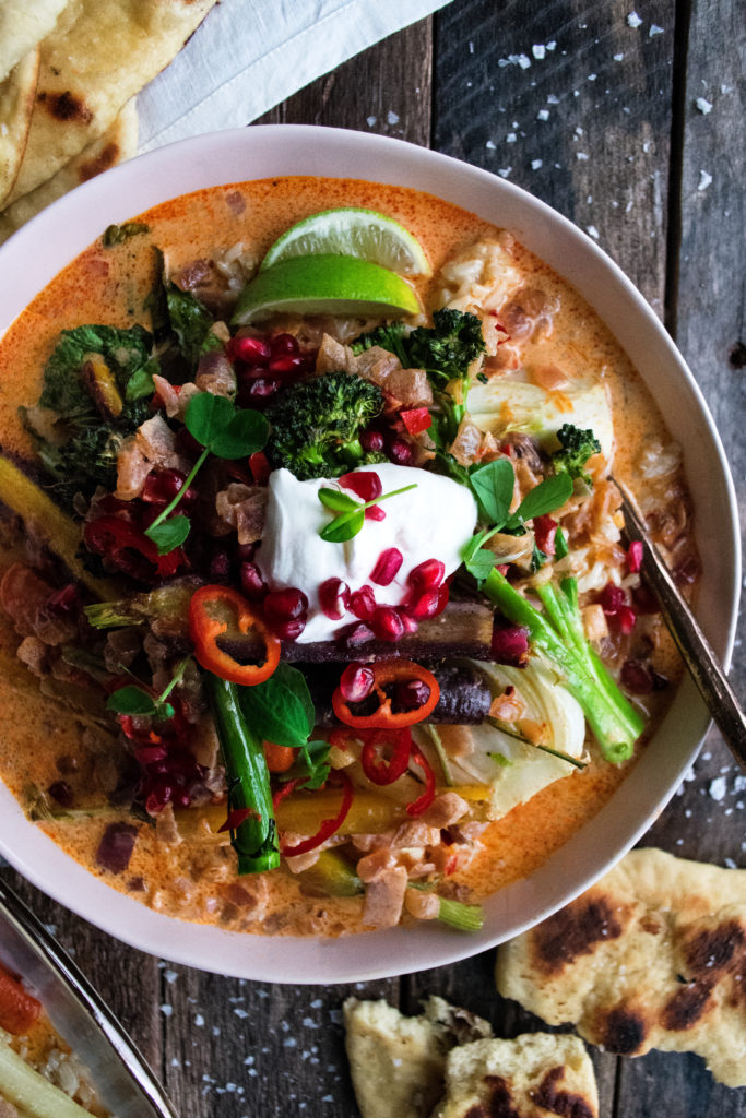 a vibrant, healthy, cozy winter dish: roasted winter vegetable coconut curry with homemade garlic butter naan bread