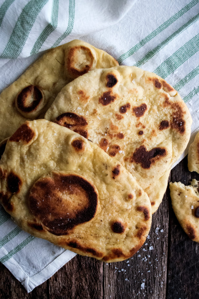 - Transfer the naan to a plate, brush the top side with more butter, sprinkle with a pinch of salt, and keep covered to stay warm and soft. Repeat with the remaining pieces of dough.