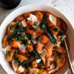 Right before serving, whisk in 1 cup of “pasta water” from cooking the gnocchi (below) to loosen the sauce. Let cook over low heat for about 3 minutes. Stir in the butter and let melt.