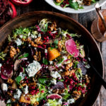 A good holiday salad starts with a variety of lettuces as the base. This adds different colors and textures and taste. Here, I’m using a blend of sharp radicchio, bitter arugula, and crisp frisee. I like to add in an element of crunch and bold flavor….hense the watermelon radishes. I also like adding roasted vegetables to any winter salad to bulk it up and make it feel more satisfying. To get the earthy undertones, a scattering of roasted mushrooms and beets goes a long way. These add a hearty component that works perfectly with the sweet pomegranate vinaigrette.