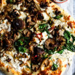 a cozy winter burrata pizza full of sautéed fennel & mushrooms, spinach, and pistachio chili honey