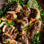 Brush the glaze onto the chicken right before serving. Garnish the chicken with a drizzle of sesame oil, the toasted sesame seeds, a pinch of sliced green onions, and a squeeze of lime juice.