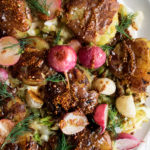 - To assemble, spread the sour cream onto a large plate. Top with the cabbage, crispy smashed potatoes, and roasted radishes. Spoon the stout mustard over top. Garnish with fresh dill and a sprinkle of flaky sea salt.
