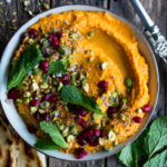 a creamy, healthy, festive spiced carrot dip with pomegranate seeds, fresh mint, pistachios, and sesame seeds