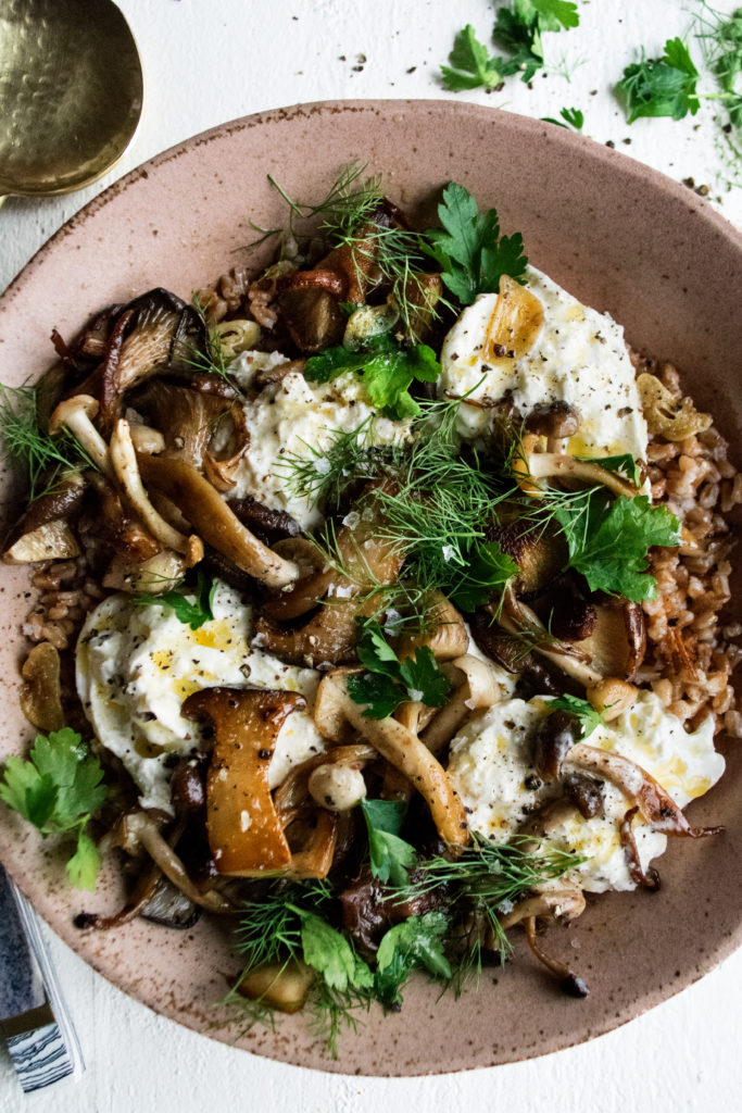 simply cooked farro tossed with brown butter, sizzled garlic, caramelized mushrooms, lemon & herbs…topped with creamy burrata cheese