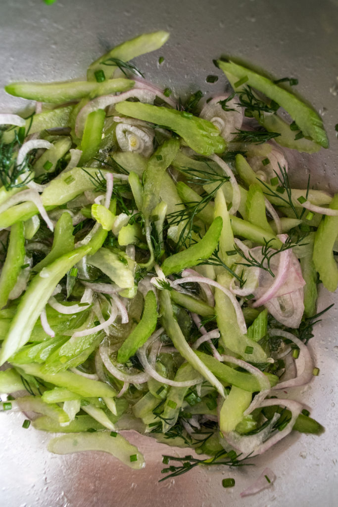 - Meanwhile, combine the shaved celery, shallot, olive oil, lemon juice, dill, and chives in a mixing bowl. Mix well and season with a pinch of salt to taste. Refrigerate until ready to serve.