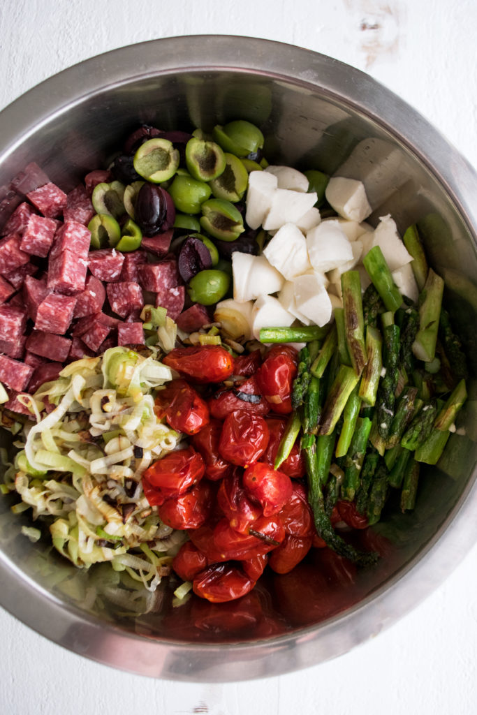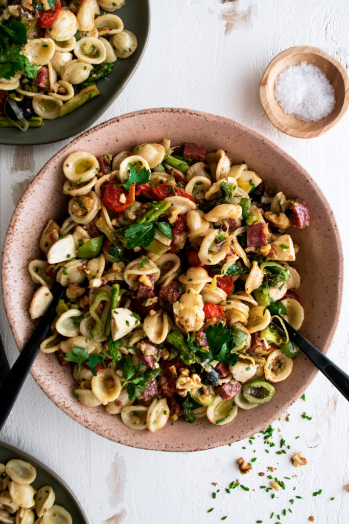 a pasta salad full of charred asparagus, caramelized leeks, burst cherry tomatoes, toasted walnuts, olives, salami, fresh mozzarella, lots of herbs, and a garlic oil vinaigrette