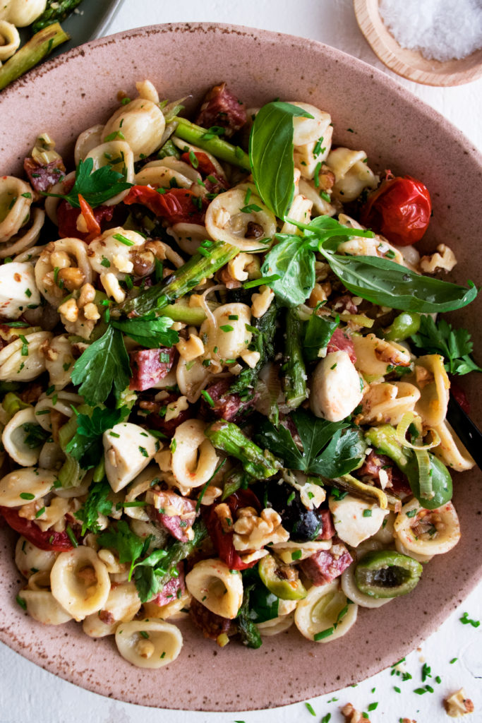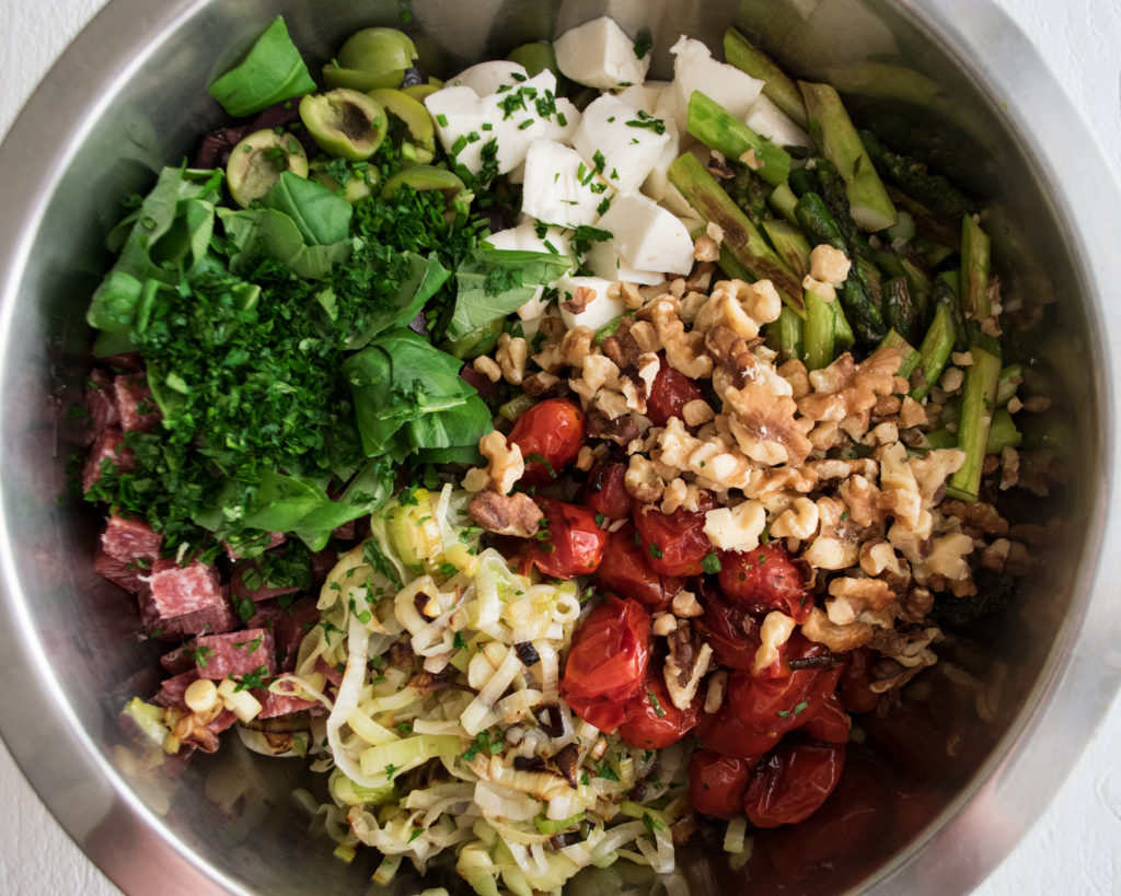 - Add the asparagus, leeks, cherry tomatoes, walnuts, olives, mozzarella, salami, parsley, chives, and basil to the pasta. Drizzle in the vinaigrette. Toss really well. Taste the pasta salad and season with more salt if needed.