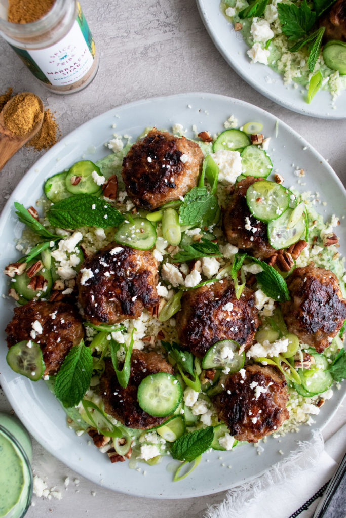 moroccan chicken meatballs with a parsley yogurt sauce, couscous, cucumbers, pecans, and feta cheese