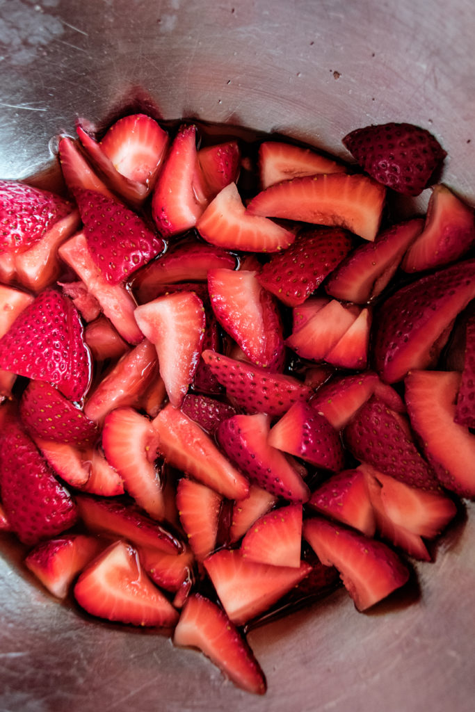 - Cut each strawberry into bite-size pieces (depending on the size of the strawberry, it may be into halves, quarters, or eighths). Add the strawberries to a shallow mixing bowl.