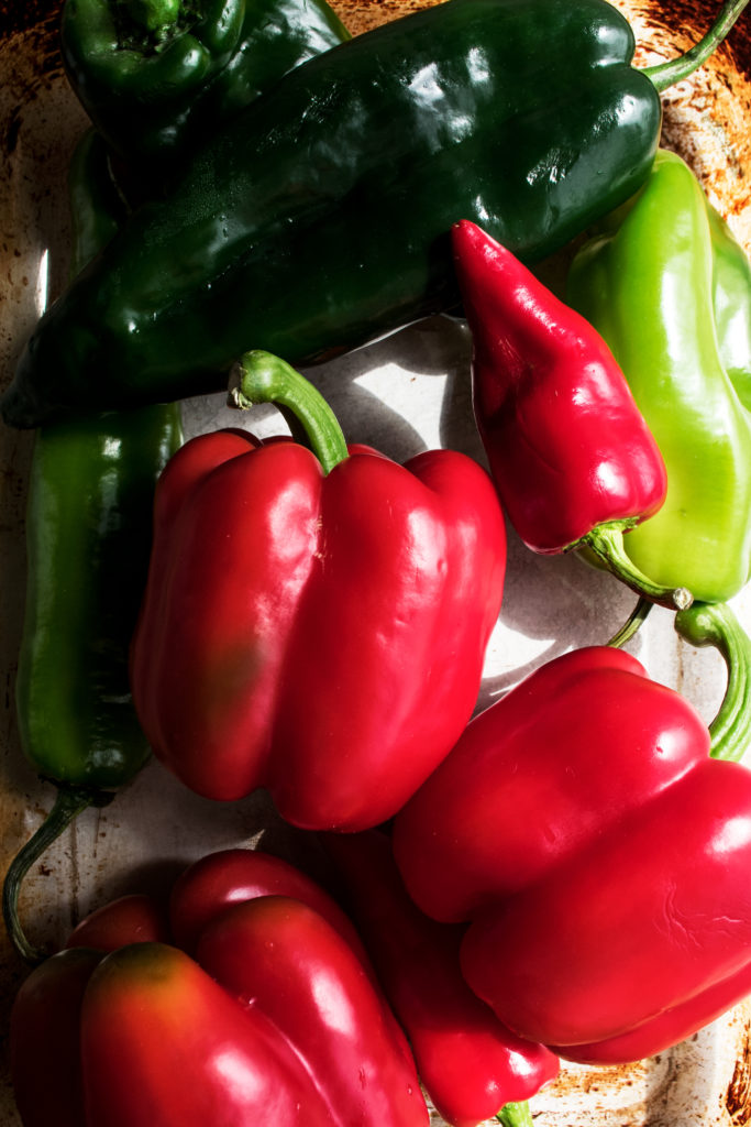 I’m combining a variety of peppers – sweet red peppers, smoky poblano peppers, vibrant anaheim peppers, and spicy red fresno chile peppers – but you can really use any peppers you like. Try to find a mix of sweet, smoky, and spicy to create an intriguing combination of flavor.