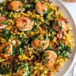 - Transfer the corn to a large plate. Place the scallops on top and garnish with the bacon. Spoon the chimichurri over the entire dish.