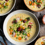 Celebrating the end of summer with the most delicious corn chowder. It’s simple and bursting with flavor, topped with a fresh mixture of scallions and beautiful heirloom cherry tomatoes.