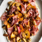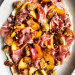 Sharing the BEST way to use up the juicy late summer peaches today – by making peaches & prosciutto with creamy ricotta. An indulgent, satisfying, and oh so tasty dish. Finished with golden croutons and a drizzle of lemony hazelnut butter. Definitely a splurge-worthy summer recipe for the long holiday weekend!