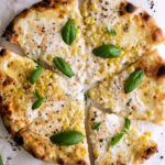 A simple four cheese corn pizza bursting with fresh flavor to celebrate the end of summer! It’s such a treat and a really easy combination to throw together. Topped with freshly cracked black pepper and lots of vibrant basil. Make this for a weekend dinner party or any weeknight pizza night!