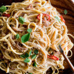 Stir in the grated parmesan cheese. Mix really well while the cheese melts into the sauce. Continue to add more pasta water if needed to keep the sauce nice and silky. Stir in the oregano right before serving.