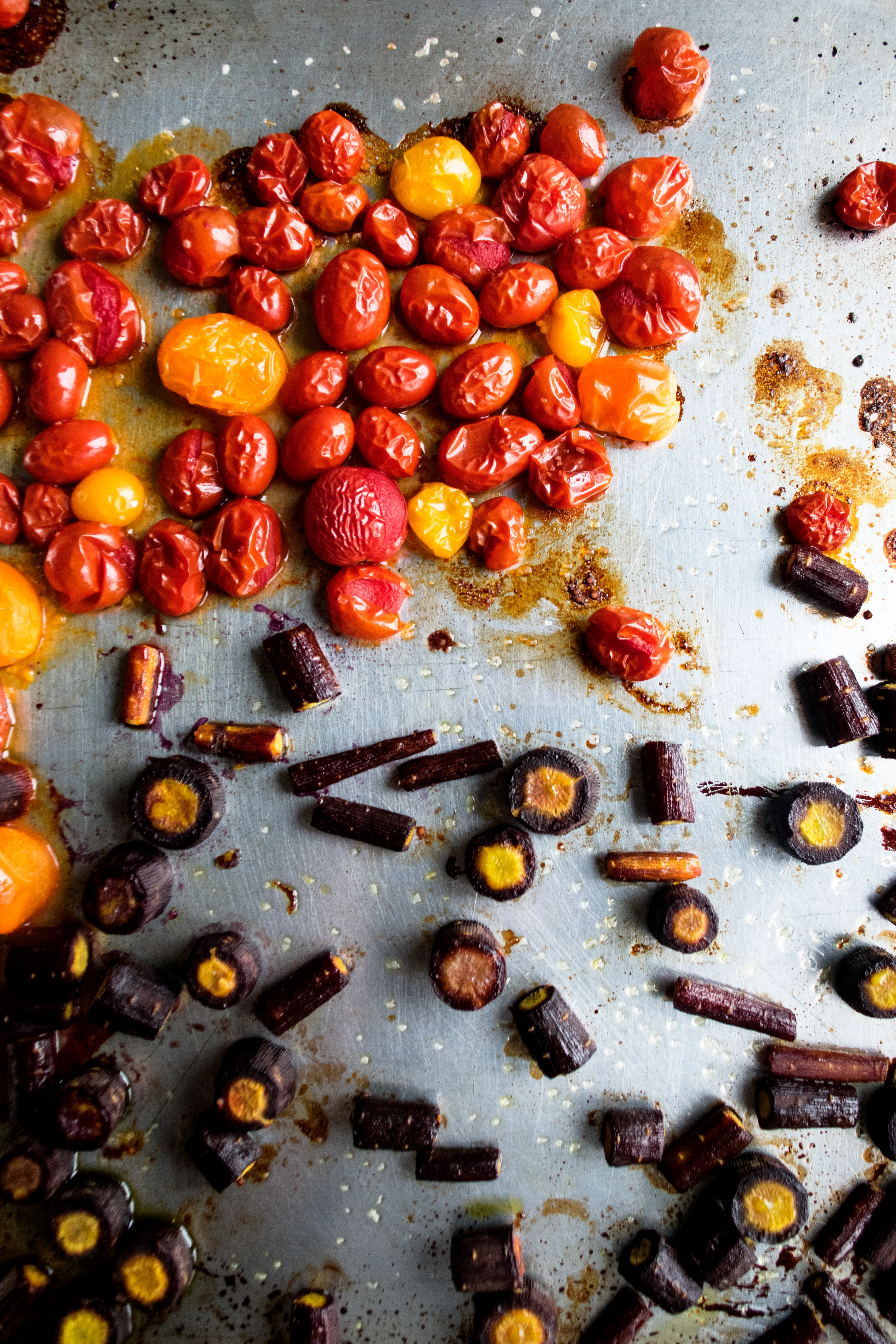- Preheat the oven to 425°F. Spread the cherry tomatoes, carrots, and eggplant out onto two sheet pans. Drizzle a generous amount of olive oil over top. Toss well, and season with a pinch of salt. Roast for 20 minutes.