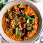 Cherry tomatoes, carrots and eggplant roasted until caramelized. Stirred into a curry sauce full of bold flavor – garlic, ginger, red chili, red curry paste, fish sauce and lime juice – and sweetened with FarmToFork Tomato Basil Sauce and creamy coconut milk. Brown rice noodles get cooked and then stirred into the pasta sauce at the very end. It’s saucy (almost soup-like), satisfying and so incredibly good.
