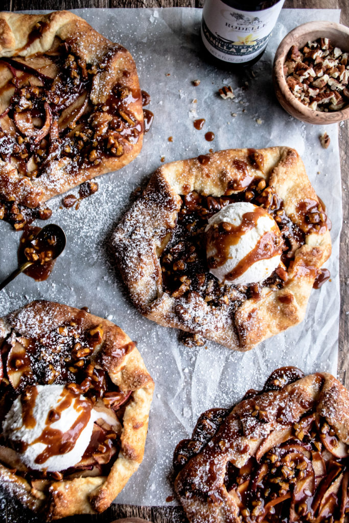 - Serve with a scoop of vanilla ice cream (optional) and a generous drizzle of vanilla pecan caramel (recipe below). Dust a little bit of powdered sugar over top.