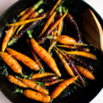 If you need a really simple last-minute side dish for your holiday table, this is it! Carrots boiled until tender, then tossed in a buttery & brown sugar glaze. Seasoned simply with a pinch of salt to bring out the sweet brown sugar flavor. It truly cannot get easier than that! We’ve been eating a version of these carrots in our family for years. They’re such a no-brainer recipe that everyone ends up loving and going back for seconds. I think they’d be the perfect vegetable addition alongside some brussels sprouts and this roasted apple salad.