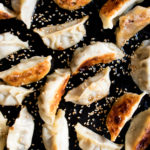 This filling gets packed into gyoza dumpling wrappers (you can make them homemade like I did or use store-bought). The wrappers are folded into a cute little dumpling and then seared in a hot skillet until golden and crisp. A little water is added and the skillet is covered so that the dumplings can steam to finish cooking. This method creates the perfect texture of crispy and soft.