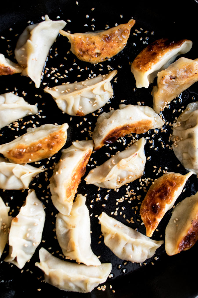 - Wipe out the skillet and place back over medium heat. Add a little bit more oil to coat the bottom. Once hot, place half of the dumplings in the hot oil with about an inch of space between them. Cook for 1 minute until the bottoms are golden and crisp.