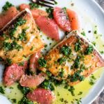 Today, we’ve got halibut on the menu! Brightened up with a simple salsa verde made of parsley, chives, jalapeno, grapefruit juice, red wine vinegar, and olive oil. The golden, pan-seared halibut gets topped with the bright green sauce and some juicy grapefruit alongside.