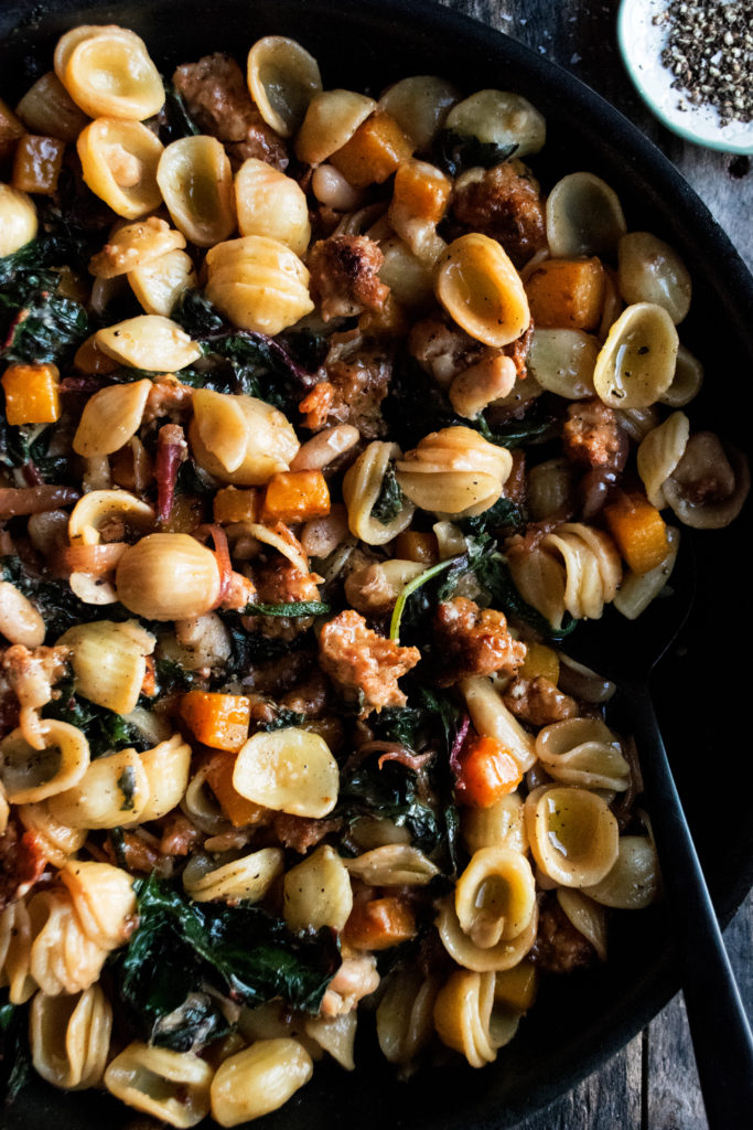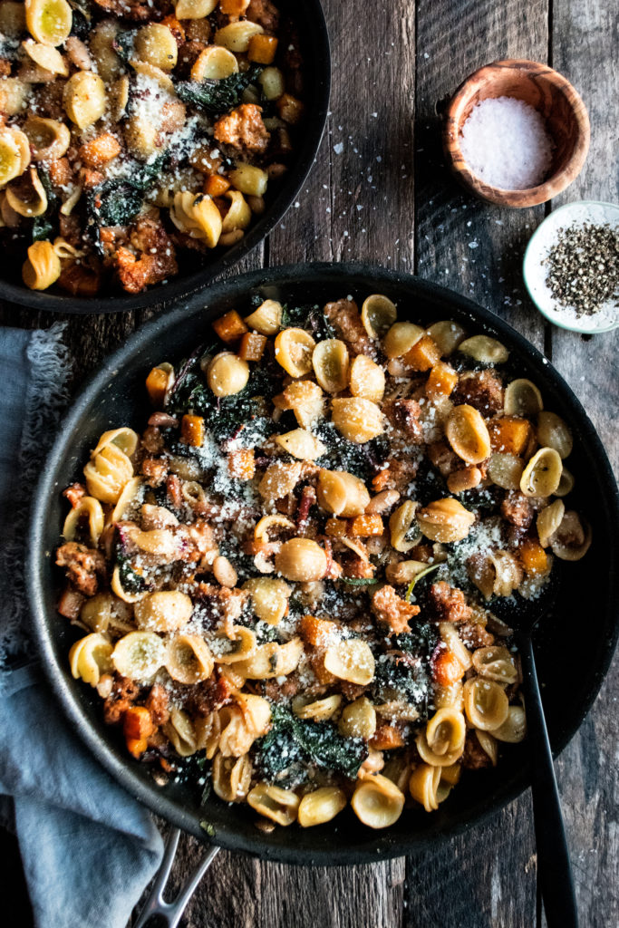 I’m naming this my essential hearty pasta dish for fall and winter: orecchiette with sausage & butternut squash. It’s a rustic-style pasta that comes together in one pan and has lots of satisfying flavor in every bite.