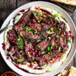 a fun and festive seared skirt steak over creamy whipped feta cheese, topped with a sweet pomegranate sauce, pomegranate seeds, pistachios, scallions, and chives