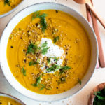 a healthy, creamy golden carrot soup topped with yogurt and crunchy pistachio dukkah