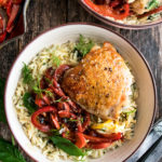 PrintCrispy Chicken Thighs with Herb Orzo & Stewed Peppers