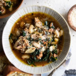 a rustic, brothy soup full of italian sausage, kale, white beans, parmesan, garlic, and crushed red pepper