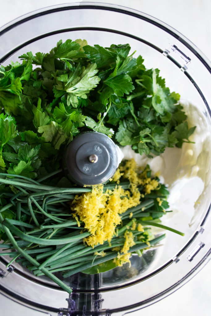 The yogurt sauce is truly what gives this farro bowl lots of refreshing flavor. I’m using my go-to kitchen appliance, the Cuisinart Stainless Steel 13-Cup Food Processor, to whip up the sauce. I use this processor SO often. It helps flavorful sauces like this come together really quickly. The bowl is large enough to hold all of the fresh herbs which take up a good amount of space. In just a few seconds, all of the ingredients – greek yogurt, parsley, basil, chives, lemon zest + juice, and dijon mustard – are blended together into a smooth, intensely flavored sauce for the farro. It also makes for a great crudité dip or even as a sauce spooned over roasted meat.