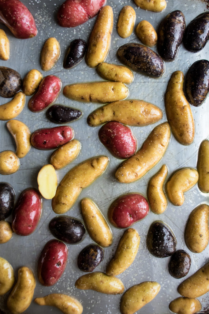 - 1 ½ lbs mixed fingerling potatoes, scrubbed + halved