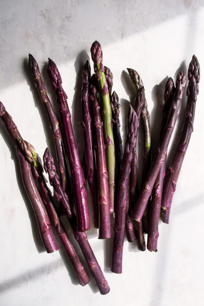 - Preheat the oven to 400°F. Place the bread onto one side of a sheet pan, with the sliced asparagus spread out on the other side. Drizzle both with olive oil and season with a pinch of salt.