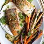 Sharing a simple salmon dinner today that’s elegant and special, yet simple enough for any night of the week. It’s served alongside roasted carrots with two sauces to bring it all together – a creamy yogurt sauce and a tangy chive vinaigrette.