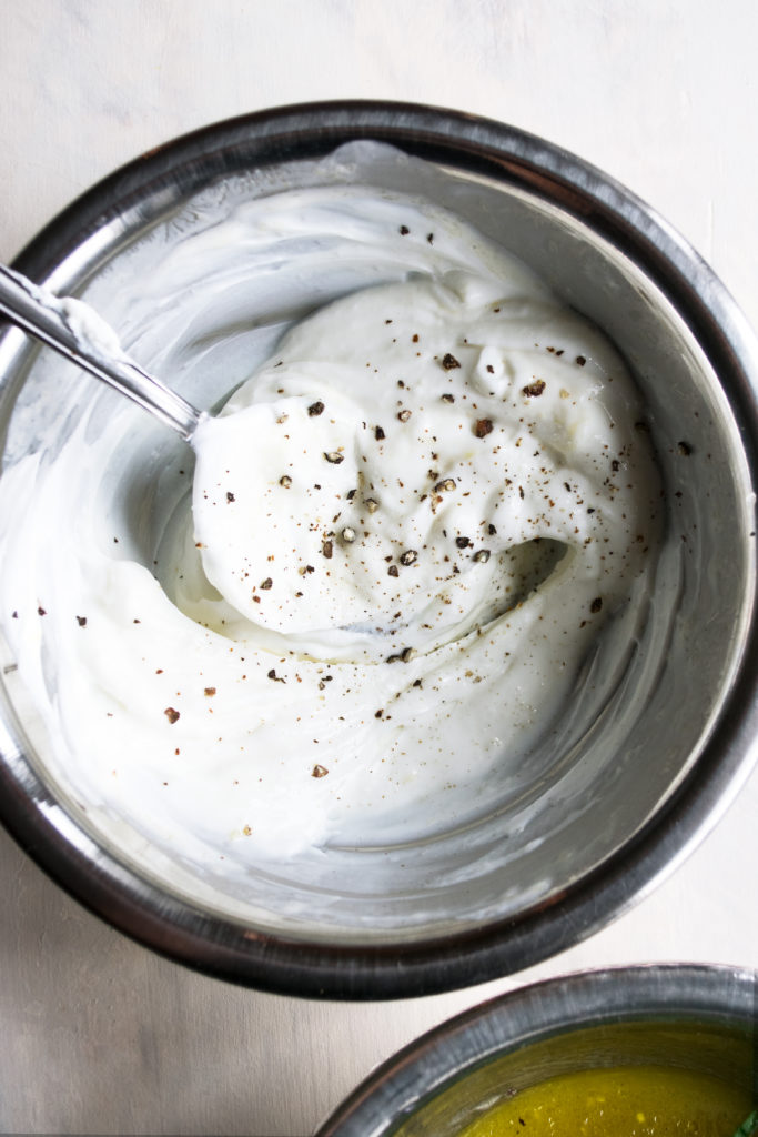 - Add the greek yogurt and lemon juice to another small mixing bowl. Stir to combine. Season with salt and freshly cracked black pepper to taste. Set aside.