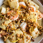 Golden, peppery lemon butter shrimp pasta! The seafood pasta you need right now – minimal ingredients, a quick process, and every bit luxurious as it sounds. Full of lemon, toasted walnuts, freshly cracked black pepper, butter, and parmesan cheese.