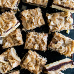 layered bars with a shortbread crust, milk chocolate center, and caramelized coconut topping