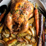Everyone needs a good roast chicken recipe in their back pocket, and this salt & pepper roast chicken dinner is that classic dish that you’ll go to time and time again. It’s the perfect complete dinner made in just about an hour or so. Golden, juicy roast chicken with roasted potatoes, carrots, fennel, and shallots alongside. Served with a bright gremolata topping and a good drizzle of olive oil.