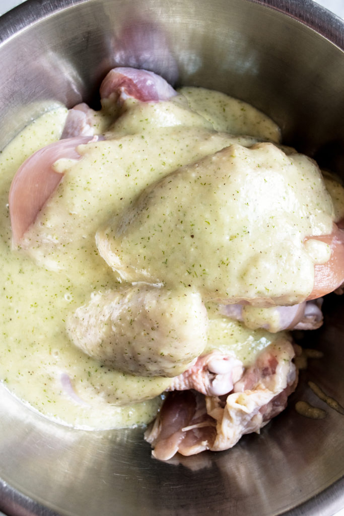 The marinade is a pungent blend of LOTS of garlic cloves (24 to be exact), kosher salt for seasoning, sprigs of dill for freshness, lemon juice for a pop of bright flavor, and oil to bring it all together. The chicken gets tossed in this mixture and then chilled for at least 2 hours (you can do it overnight as well).