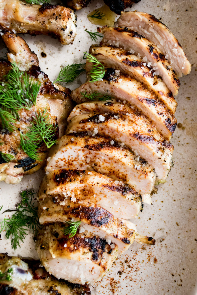 Once the chicken is done marinating, you’ll start it on the grill over the hottest possible heat. This will give you nice char marks on each side. I then like to move the chicken to a lower heated part of the grill, close the lid, and allow the chicken to finish cooking there. A lower heat after the quick char will keep the chicken nice and juicy.